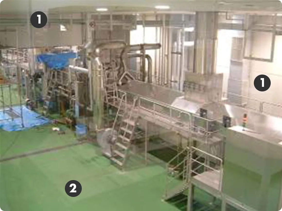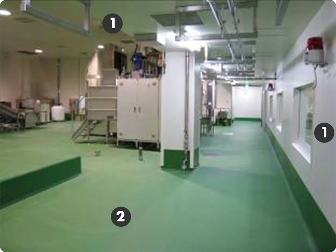食品工場では部屋の機能や使用方法に応じて、ウェット/ドライ仕様、耐熱性、耐水性、ノンスリップ、清掃性などを考慮し、また長期にわたり部屋を有効的に使用するため適切な仕様選定を行うことが大切です。